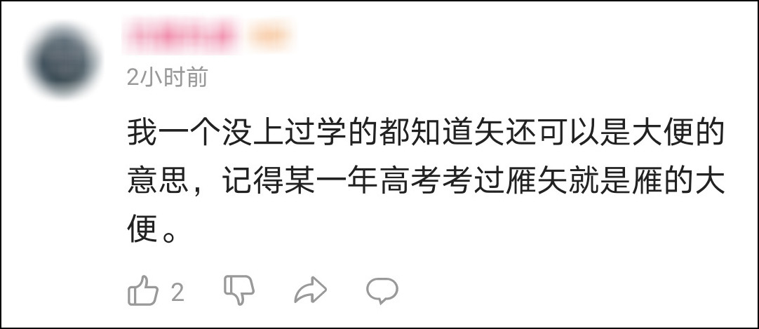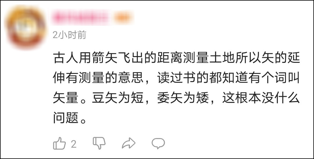 還有網友繼續幫忙補充。例如,因為通假,“矢”還有糞便的意思,《史記·廉頗藺相如列傳》中就有“雁矢”一詞的出現;又如,古人用箭矢飛出的距離測量土地,所以“矢”延伸開後,還有測量的意思,所謂“豆矢為短,委矢為矮”説的就是這麼個情況。