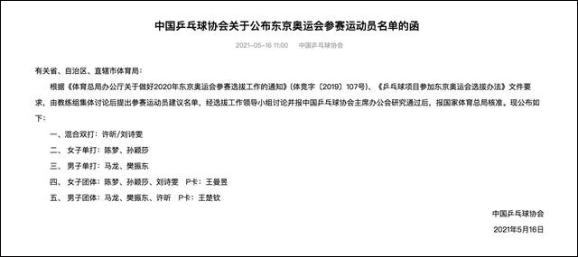 5月16日,中國乒協正式公佈中國乒乓球隊東京奧運會參賽名單:
