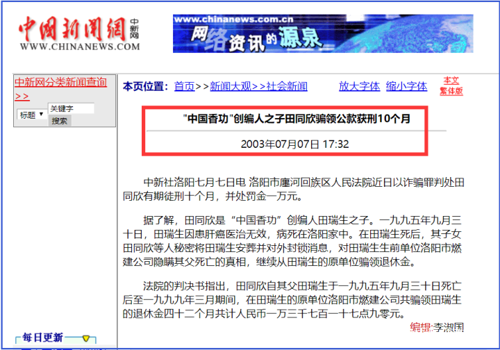 田瑞生的香功,也曾風靡全國,據説還譽滿全球。其特點是在進行一套類似體操的動作時,能夠聞到香味,所以稱為“香功”。據創立者田瑞生説,這套功法源自古代達摩、玄奘等佛教、也有道教的大師,所以能夠治療百病,包括癌症。實際上,田瑞生的所謂香功,很可能是明清之際一種稱為“聞香教”的巫術的後裔。田瑞生曾作過一場為人治療癌症的報告,但半年後邊,他卻患癌症去世。死後其子女秘不發喪,繼續領取退休金,被河南洛陽市有關部門發現後給予相應的處罰。