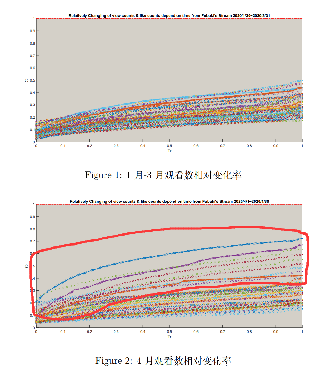 以白上吹雪的數據為代表,圖一和圖二將1月-3月的數據和4月做了對比後,發現了起碼9場偏離了歷史擬合數據的直播。簡而言之,出現了最少9場明顯優於傳統直播數據的直播,即紅圈部分。圖三便是在去除底噪後判定有數據有問題的直播。明顯發現,數據有問題的直播次數比9場多。