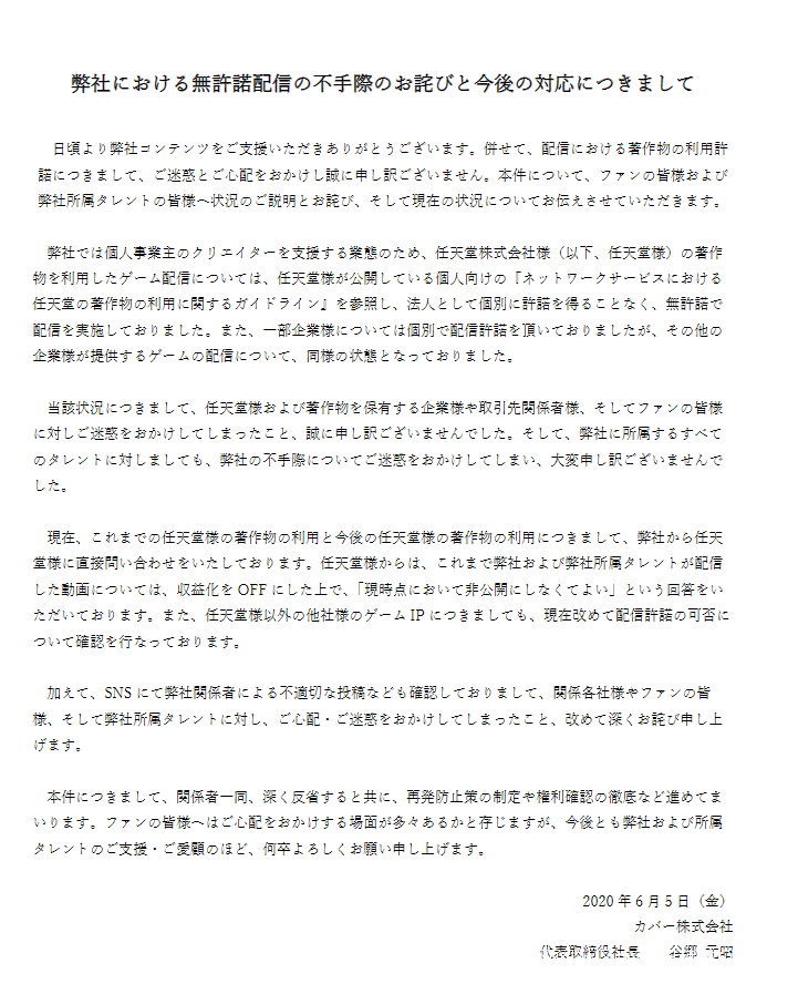 圖六和圖七為Cover關於任天堂以侵犯版權為由下架大量Cover旗下主播視頻的公告。Cover當時對Cover與主播間的關係定義為“Cover只是給個人勢主播提供支援業務”,在直播任天堂內容時參考的是個人勢主播的條款而不是企業勢相關條款。換而言之,Cover旗下主播更像是相對自由的加盟個人勢主播,並不是正式員工。同時,這公告落款是2020年6月,側面反應內鬥導致嚴重的版權事故一直被拖着沒有解決直到爆發。