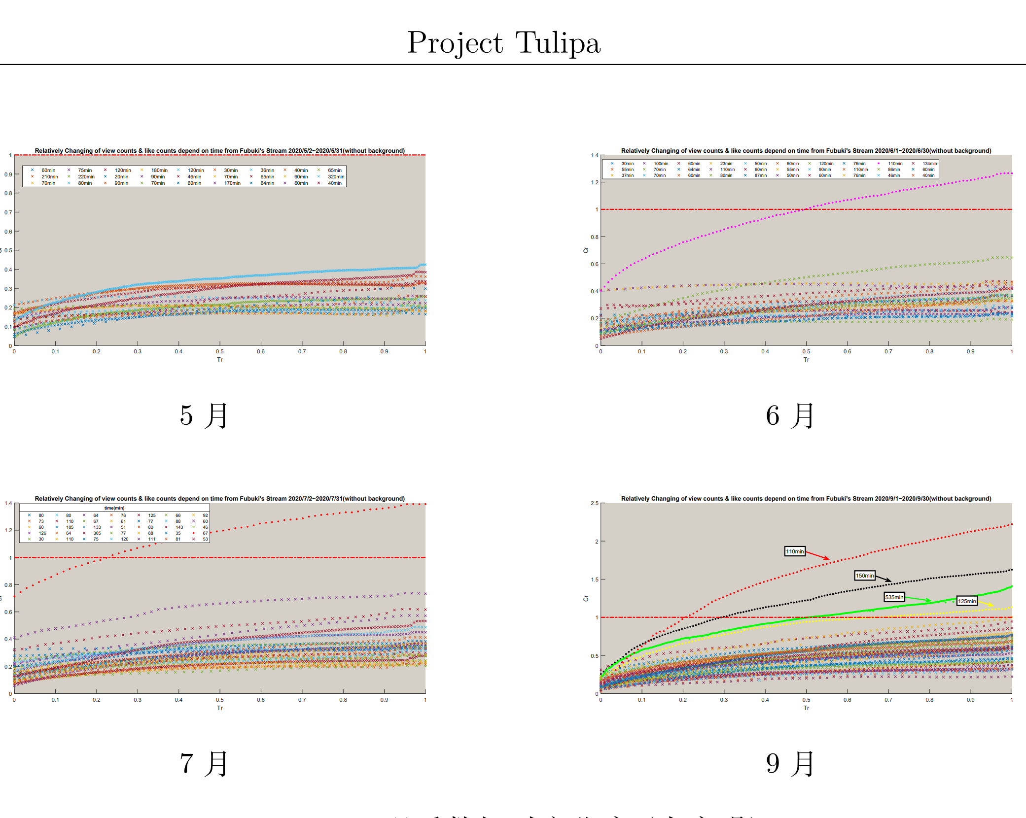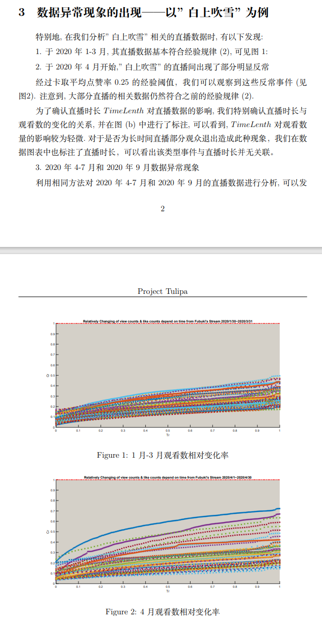 鬱金香計劃在處理完數據並嘗試建模後,發現可以利用三階多項式可對該類型數據進行高度近似的描述。換句話説,即可能存在多種不同行為模式的“觀眾”在點贊。這一觀眾羣不符合任何YouTube觀眾普遍採樣。更別説在2021年4月8號後,油管疑似再次升級反bot力度,最近白上吹雪和桐生可可的直播點贊數每場都消失了3千到4千。買數據一事基本坐實。