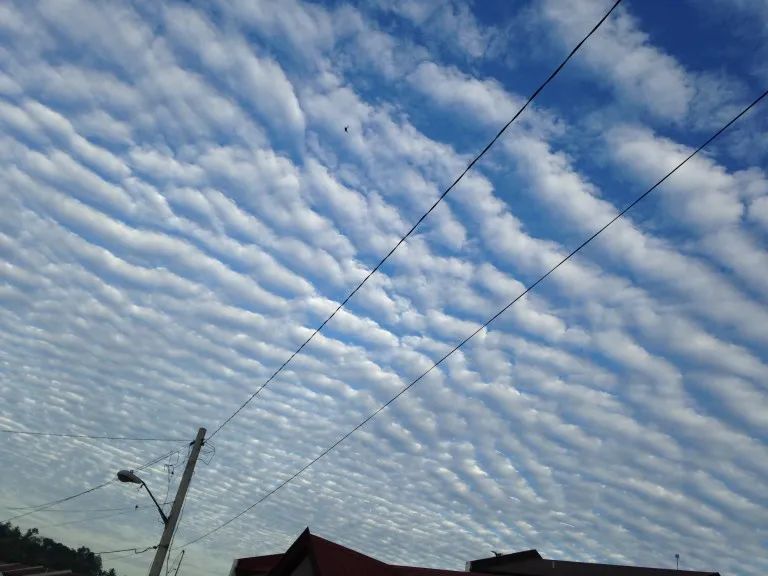 那麼,波狀雲在地面上看是什麼樣的呢?我們平時在地面上看到的這樣的雲就是內波卷出來的。這種天空也被叫做魚鱗天(mackerel sky)。一般來説看到這樣的天空,天氣就很可能會發生變化。這招觀天你學會了嗎?