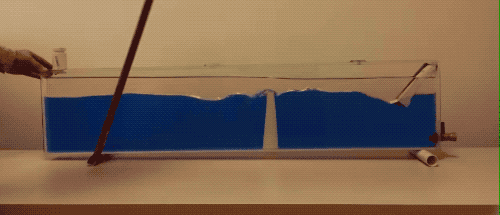 在水(藍色)和油(透明)的交界處形成了內波。圖片來源:Portland State University