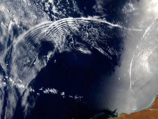 大氣具有冷熱分層的空氣時也會形成內波。下面是澳洲北部大氣中的內波形成的波紋,我們看到的是雲在經過內波時被裱出的花。這種能揭示大氣層中內波的雲也被稱為波狀雲(wave clouds)。