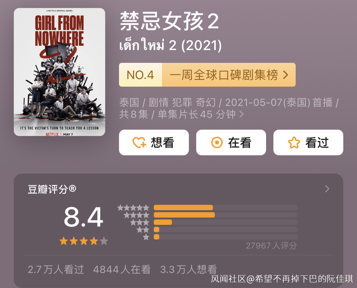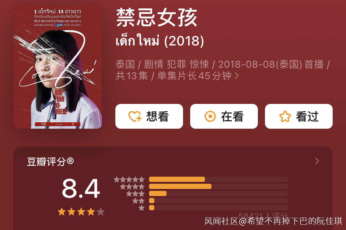兩部《禁忌女孩》的豆瓣評分都高達8.4分,位列豆瓣高分經典泰劇榜第三名