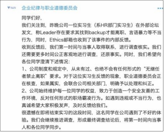 目前,字節跳動紀律與職業道德委員已做出初步回應,表示已經與當事人取得聯繫並在進行調查核實。此外,委員會強調,公司的制度和規定中從未有過、也絕不會有任何形式的“無繼任者禁止離職”的要求。