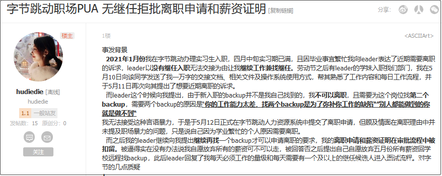 13日,一位北大學生在北大校內BBS“北大未名”發佈4000字長貼,講述了自己在字節跳動實習時遭遇“職場PUA”並被拒批離職申請和薪資證明的經歷。