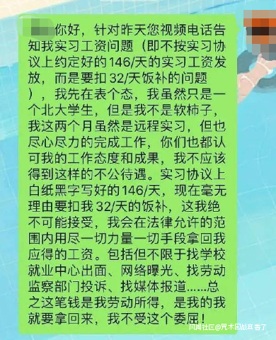 2020年9月,一檔“年輕人跟社會較勁”的故事從豆瓣流傳到了整個網絡平台。故事中,同為北大學生的小王同學(化名)在一家公司遠程實習期間,與公司達成146元/天的實習待遇協議。然而發放工資時,小王卻發現自己被扣除了32元每天的飯補。