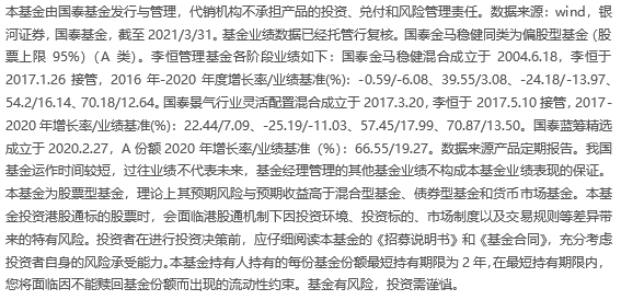 李恆的代表作,國泰金馬穩健,自2017年1月26日管理至今,任職總回報165.36%,年化回報26.31%。最近5年業績,位居同類第一名。(wind,截至2021.3.31,相關業績數據已經託管行復核,國泰金馬穩健同類為偏股型基金(股票上限95%)(A類))