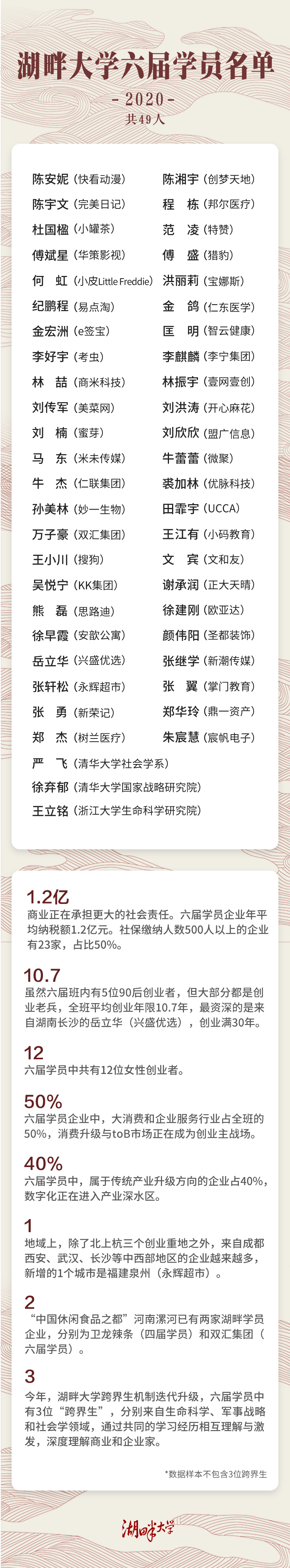 目前,湖畔大學已公佈的學員名單隻到2020年的第六屆。2020年5月25日,湖畔大學公佈49人新學員名單。據其介紹,第六屆學員企業年平均納税額1.2億元,社保繳納人數500人以上的企業有23家,佔比50%。