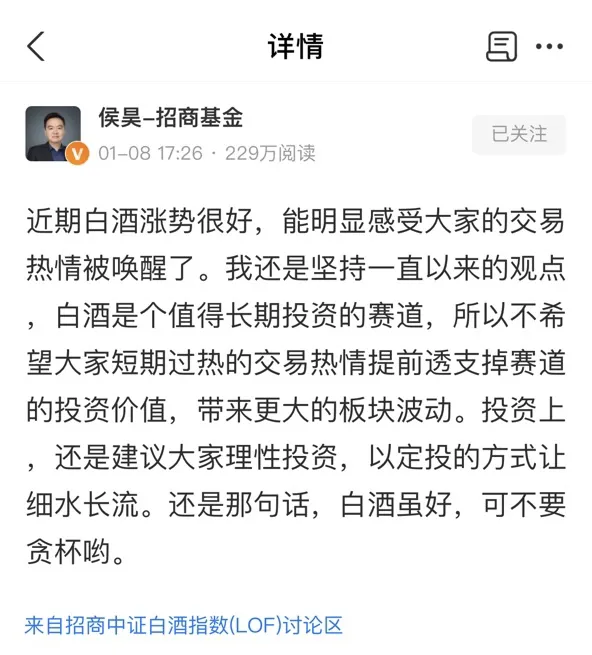 “一頓操作猛如虎,不如全倉白酒股”?白酒市場這些年風生水起、一路高歌,用“沾酒即瘋”來形容一點都不為過。去年底,白酒股熱度高漲,全民狂歡,但侯昊卻發出勸誡“白酒雖好但不要貪杯”,提醒基民理性投資,甚至有暗示“落袋為安”的意思,對以規模為大的基金行業來説,能夠在基民熱情高漲蜂擁而入時出面勸阻,除了研判能力和市場把握的精準之外,職業操守也是值得肯定的。