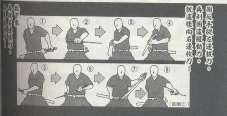 居合術的練法有很多種,流派不同不一樣,有流派是刀刃朝下,正面從下斬起,也就是所謂正手刀法,例如藥丸自顯流、初實劍理方一流,這一類刀法被視為主流;有的則是刀刃朝上,也有流派精於此道。不論怎麼樣,其出刀都包括前期的準備,例如調整視野、呼吸、注意握刀姿勢和推刀鍔離開鞘口的技法等,而後就是拔付、切下、血振(甩掉刀上的血)、殘心(防備垂死的敵人反擊)和納刀這幾個過程。至於具體動作和講究,各流派有各自的技藝,筆者也沒練過,不做過多敍述。