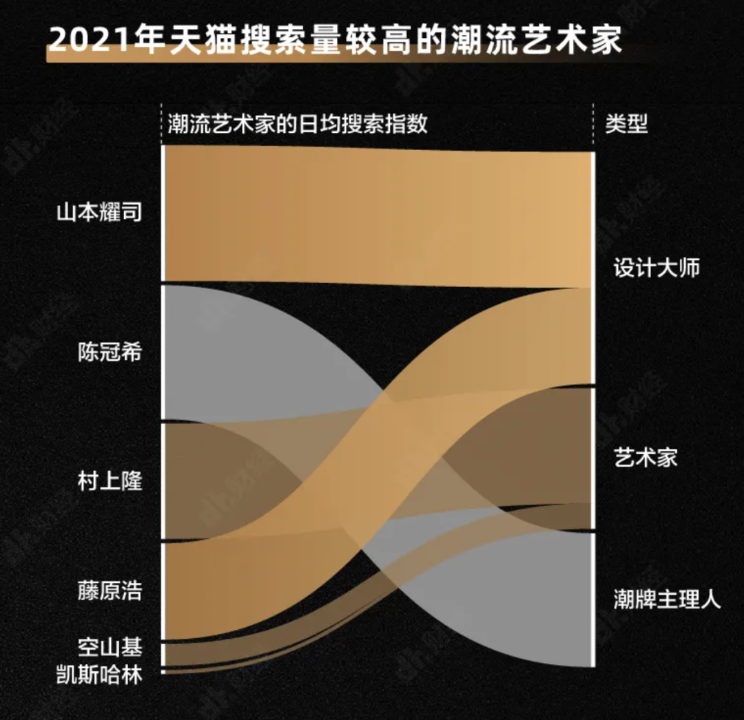 在天貓上,2021年搜索量居高不下的潮流大師就包括設計大師山本耀司、藤原浩、潮牌主理人陳冠希、藝術家村上隆等,他們的聯名設計款備受年輕人關注。