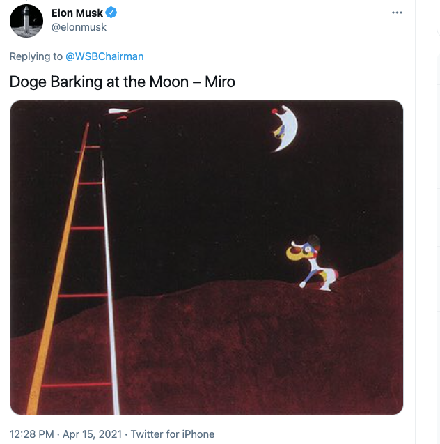 次日,馬一龍在推特回覆一名叫WSBchairman的網友,一張狗狗在月球上咆哮的圖片。