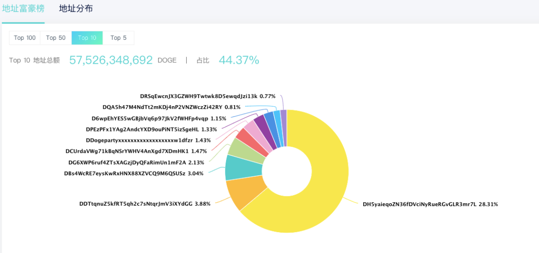 據統計,截至目前狗狗幣前十大持有者掌握着全網44.37%的狗狗幣。