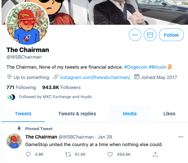 回頭來看,4月15日與馬一龍在推特互動的這名網友“WSBchairman”,名字也十分值得深究。