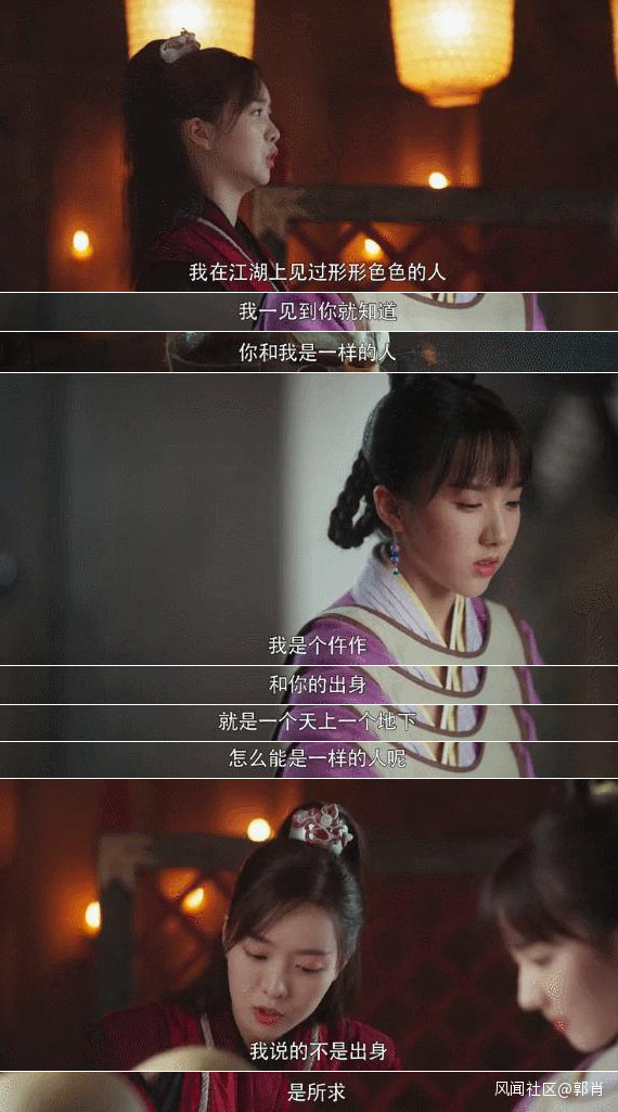 女二和男主、女主之間也沒有狗血的三角關係。看到女主全心全意爭取自己的目標,她深受感動,感慨“這世道給女子的機會並不多,我知道你和我是一樣的人,因為所求”。