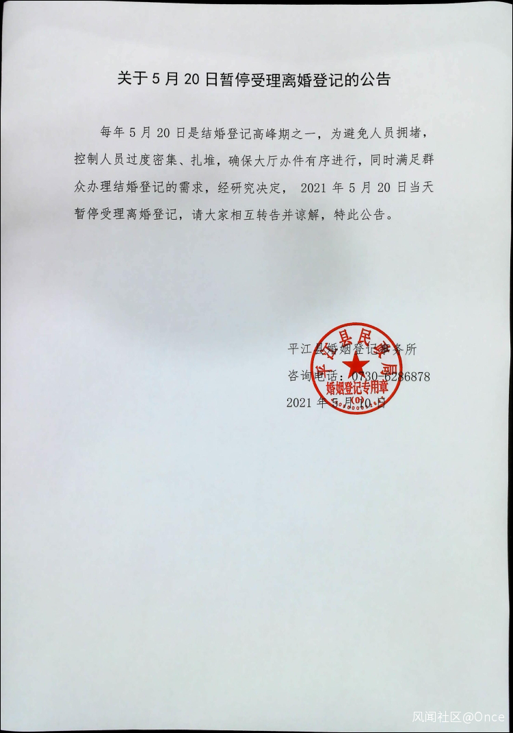 無獨有偶,湖南嶽陽平江縣民政局也於5月10日發佈公告稱,因5月20日是結婚登記高峯,為避免人員擁堵,控制人員密集、扎堆,同時滿足羣眾辦理結婚登記需求,當天將暫停受理離婚登記業務。