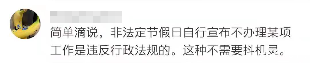 還有網友直言:“非法定節假日自行宣佈不辦理某項工作是違反行政法規的。”