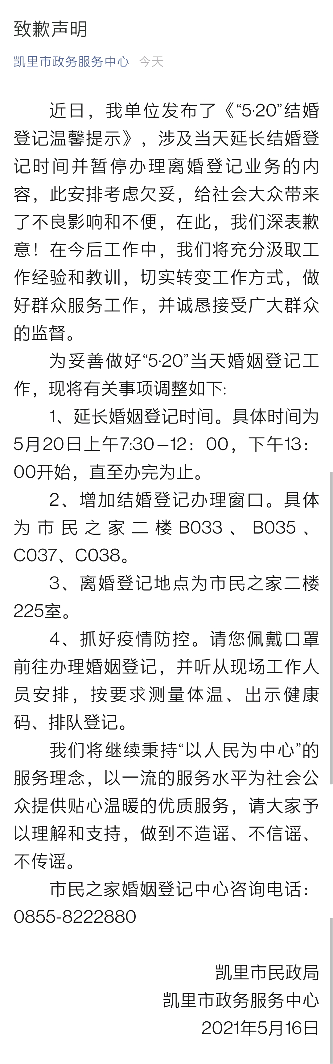 5月20日,凱里市政務服務中心在其官方微信公眾號上發佈致歉聲明,表示5月20日不辦理離婚的安排欠妥,對此事給社會大眾帶來的不良影響和不便,深表歉意!