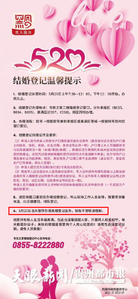 5月15日,凱里市政務服務中心發佈《“5·20”結婚登記温馨提示》,為保證“520”當天準新人們都能如願領證,5月20日,該中心工作時間調整為上午7點30分至12點,下午1點開始辦理,直到辦完為止。此外,當天將暫停辦理離婚登記業務。