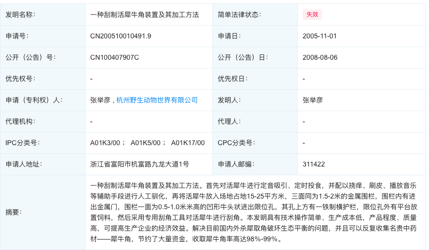 時間撥回到2005年,企查查顯示,杭州野生動物世界的實控人張舉彥曾申請一項專利,名稱為“一種刮制活犀牛角裝置及其加工方法”。該專利描述稱:" 本發明具有技術操作簡單、生產成本低,產品程度、質量高,可提高生產企業的經濟效益。解決目前國內外殺犀取角破壞生態平衡的問題,並且可以反覆收集名貴中藥材——犀牛角,節約了大量資金,收取犀牛角率高達 98%-99%。"