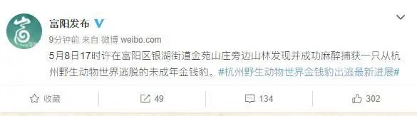 5月8日,黃金週已過去,微博@富陽發佈 稱,救援隊麻醉並捕獲一隻金錢豹。當晚,杭州野生動物園發佈致歉聲明,稱確有三隻金錢豹出逃。