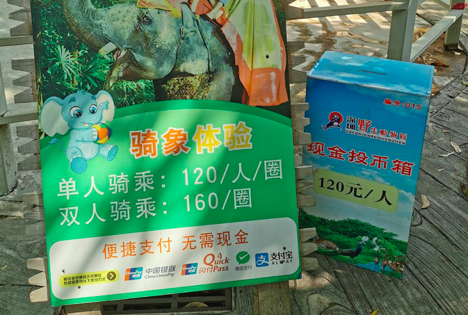 園內的設施也簡陋老舊,毫無場館設計可言。在這裏幾乎看不到野生動物的天生狀態,狹小的籠子隨處可見,倒是能看到不少動物刻板行為。不過,創收的項目倒是隨處可見。不僅二百多元的票價在動物園中實屬翹楚,園內付費投餵、付費騎象、付費合照、付費觀看馬戲表演……只要你肯花錢,娛樂動物易如反掌。所謂動物保護,所謂科普教育,在這裏難覓蹤跡。