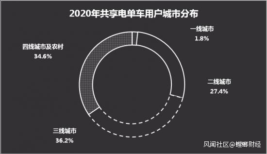 艾媒諮詢2020年數據顯示,共享電單車用户城市分佈當中,一線城市僅佔1.8%,二線城市佔據27.4%,三線城市佔據36.2%,四線城市及農村的用户佔比達到34.6%,一二線城市的佔比之和都比不上三線或四線城市。