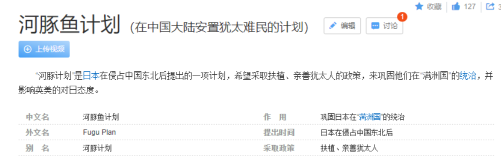 當年的日本軍國主義者,和猶太復國主義者乃是一丘之貉,他們甚至還想在我國東北搞“河豚魚計劃”,建立“猶太人定居區”。日本許諾對猶太人不採取歧視政策,並給予他們一塊土地復興猶太國,猶太人則用他們的財富幫助日本人在東北和以後被侵佔的土地上進行投資,並影響美國的對日政策。這個計劃是真正準備實施的,當時猶太人大量蜂擁而至,僅哈爾濱一地就有近三萬猶太人。猶太人以亞伯拉罕·考夫曼醫生和吉塞廖夫拉比為領袖,在東北建立了完整的猶太社區,有學校、醫院、銀行、養老院和墓地,以及大規模的猶太會堂。一時間猶太社區,猶太教堂遍地開花。日本憑藉着猶太人的大量資金,使東北迅速成為東亞最重要的工業中心。在中國的日本佔領區,日本人給予猶太人和日本人平等的待遇,而中國人成為了“二等公民”。
