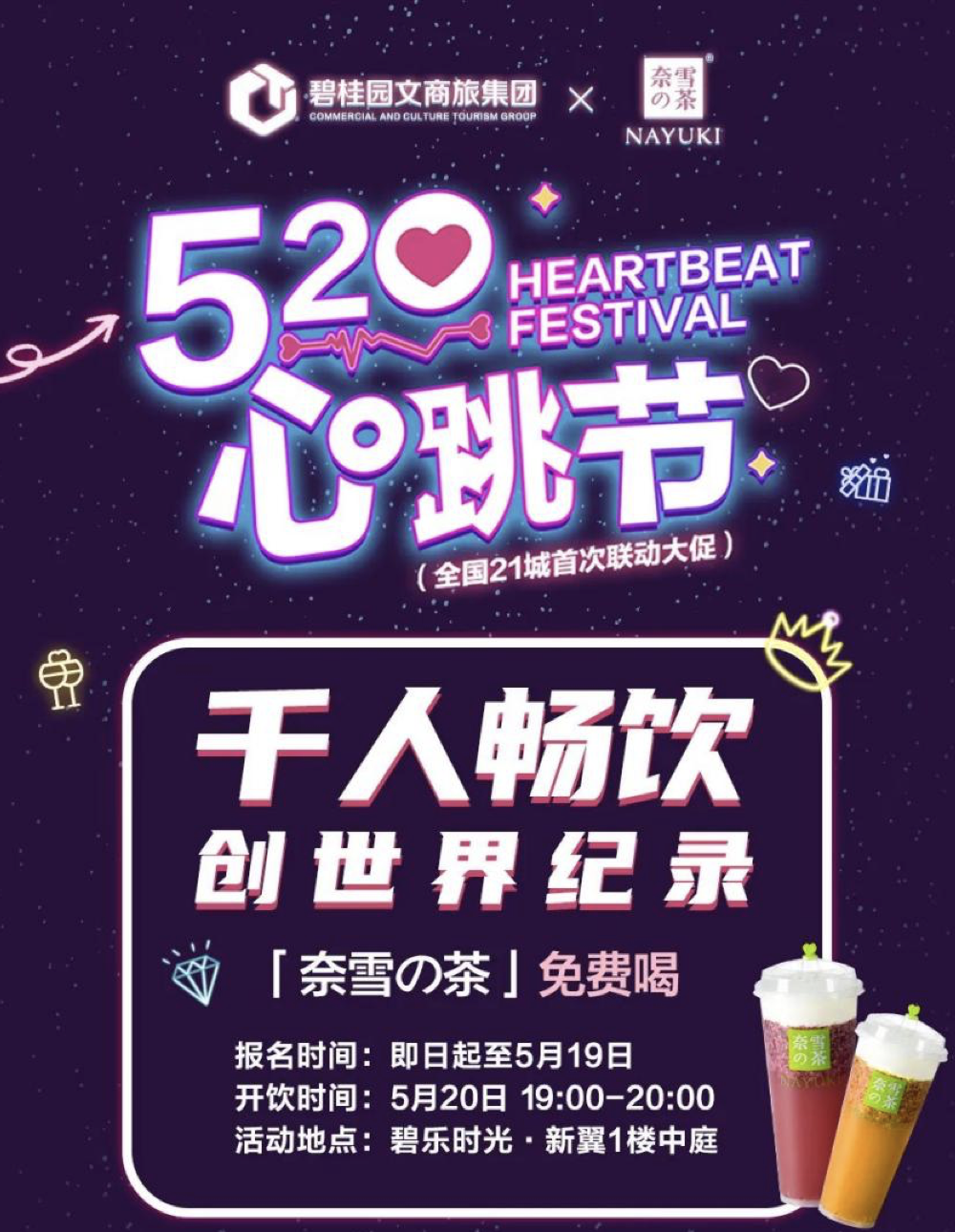 隨着“後浪”崛起,“Z世代”青年逐漸成為商業消費市場的主力軍。隨之而來的,是“顏值即正義”、“粉絲效應”、“網紅經濟”等新興消費趨勢。緊抓這一趨勢,碧桂園文商旅於此次心跳節探索“網紅營銷”,跨界網紅茶飲品牌 —— 奈雪的茶,推出“千人同飲奈雪”活動,並將嘗試申請史上最多人同飲奶茶的世界紀錄,展示了碧桂園文商旅在跨界營銷和聚焦年輕流量方面的突破式創新。