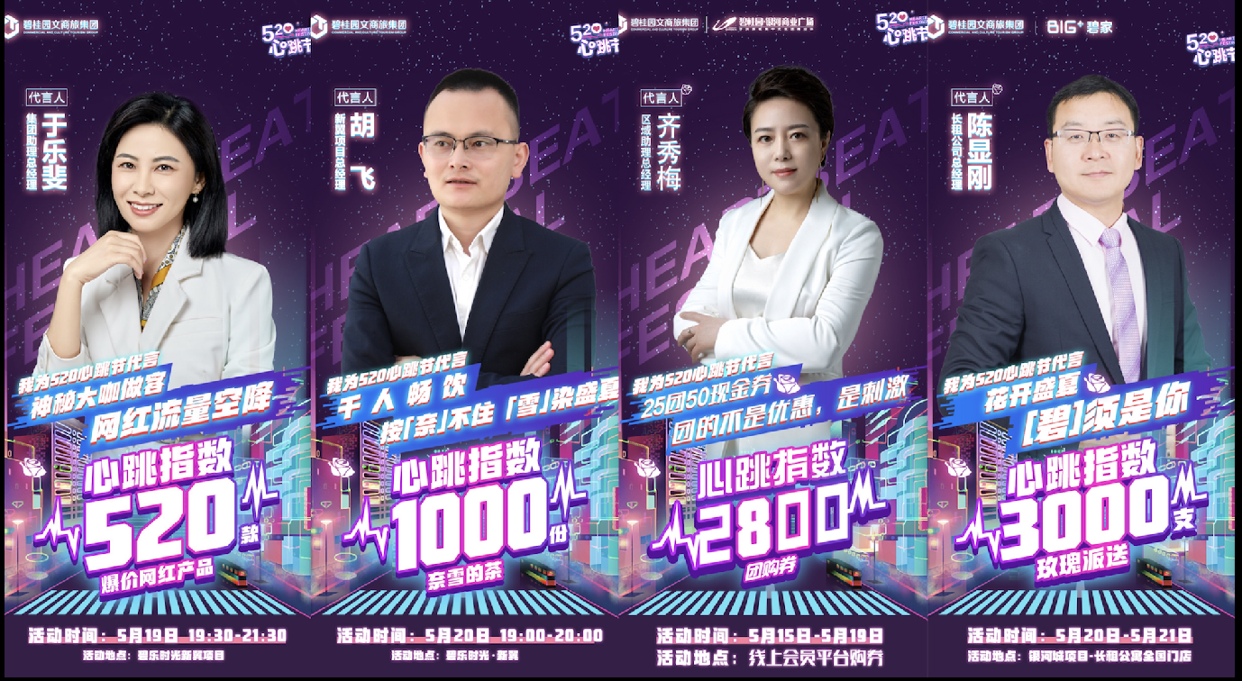 5月19日至5月23日,碧桂園文商旅推出520營銷“組合拳”,包括大咖心動直播間、我為心跳節代言、線上告白季等線上造勢和話題傳播,也有愛情斑馬線、玫瑰派送、浪漫氣球雨等線下互動場景打造。碧桂園文商旅品牌文化與520情感營銷所形成的交叉點,讓此次“心跳節”的營銷活動顯得自然而不刻意,同時結合線上線下渠道的融合,更容易被年輕消費者所接受,從而引發系列傳播,突破品牌闕值。