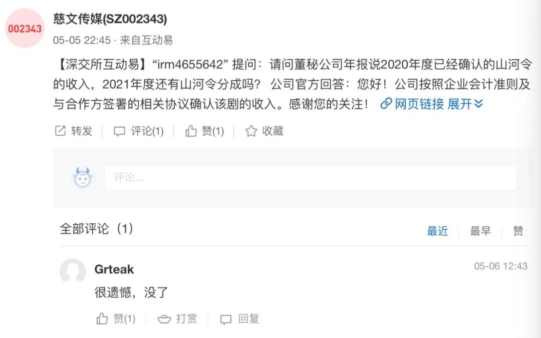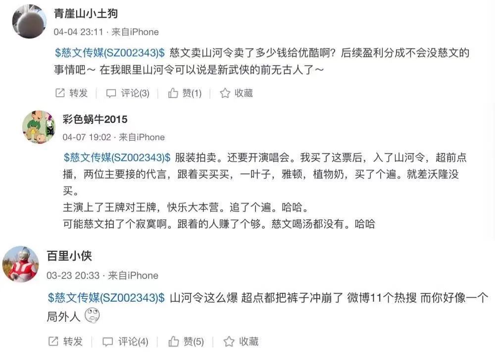 自今年3月《山河令》的網播熱度一路走高以來,慈文在某股票平台上的留言區就被心急火燎的股民攻佔。不斷有人發問:《山河令》的收入確認了嗎?