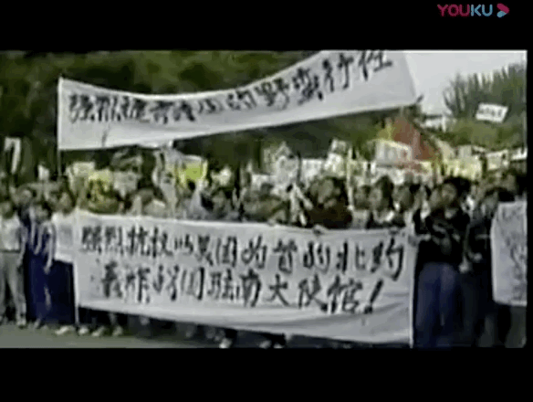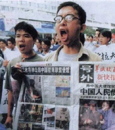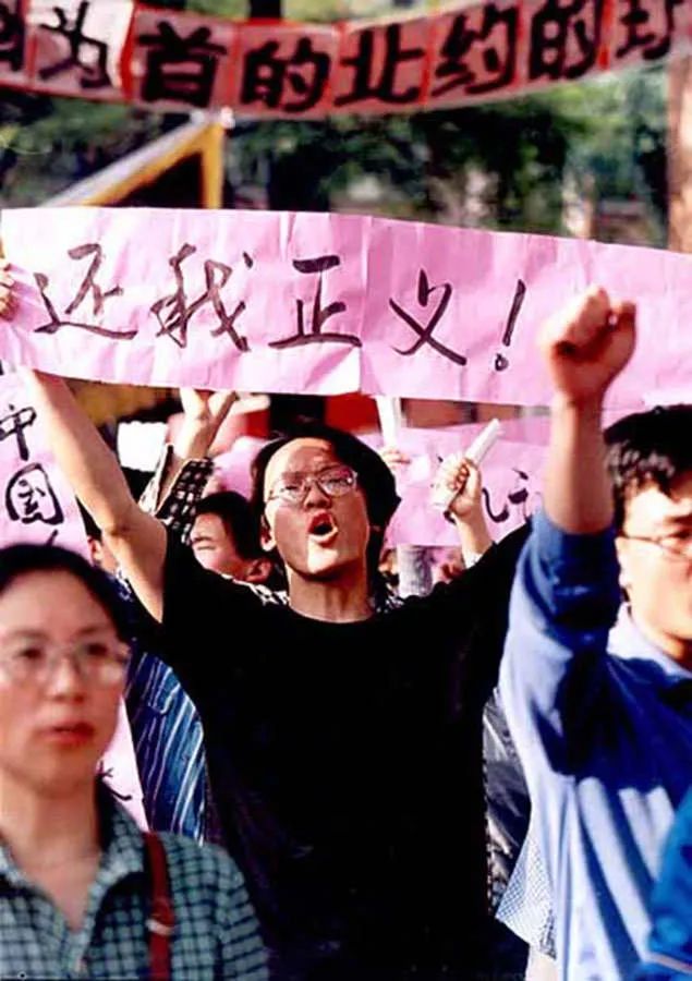振臂高呼“強烈譴責美國霸權主義行徑”、“還我正義”、“嚴懲北約暴行”、“中國不可欺,中華民族不可侮”的口號。