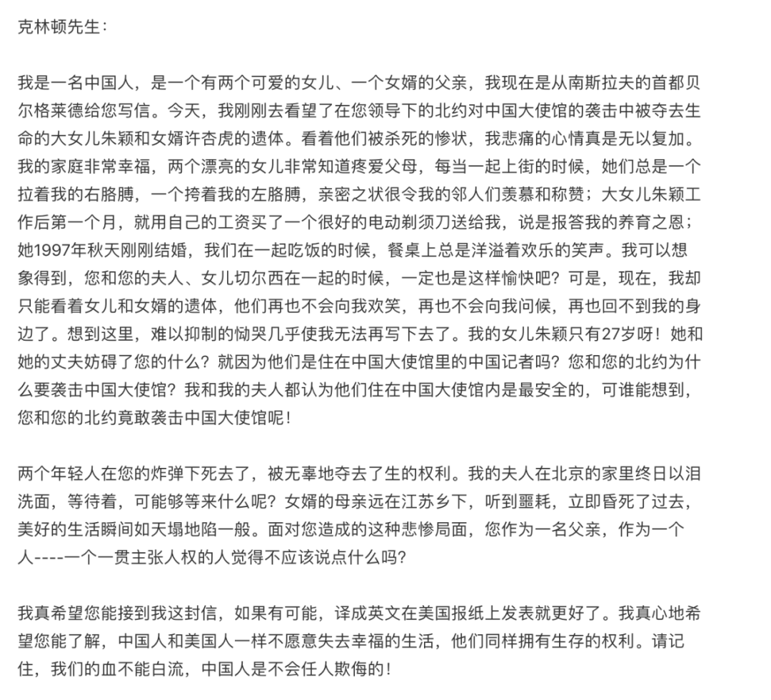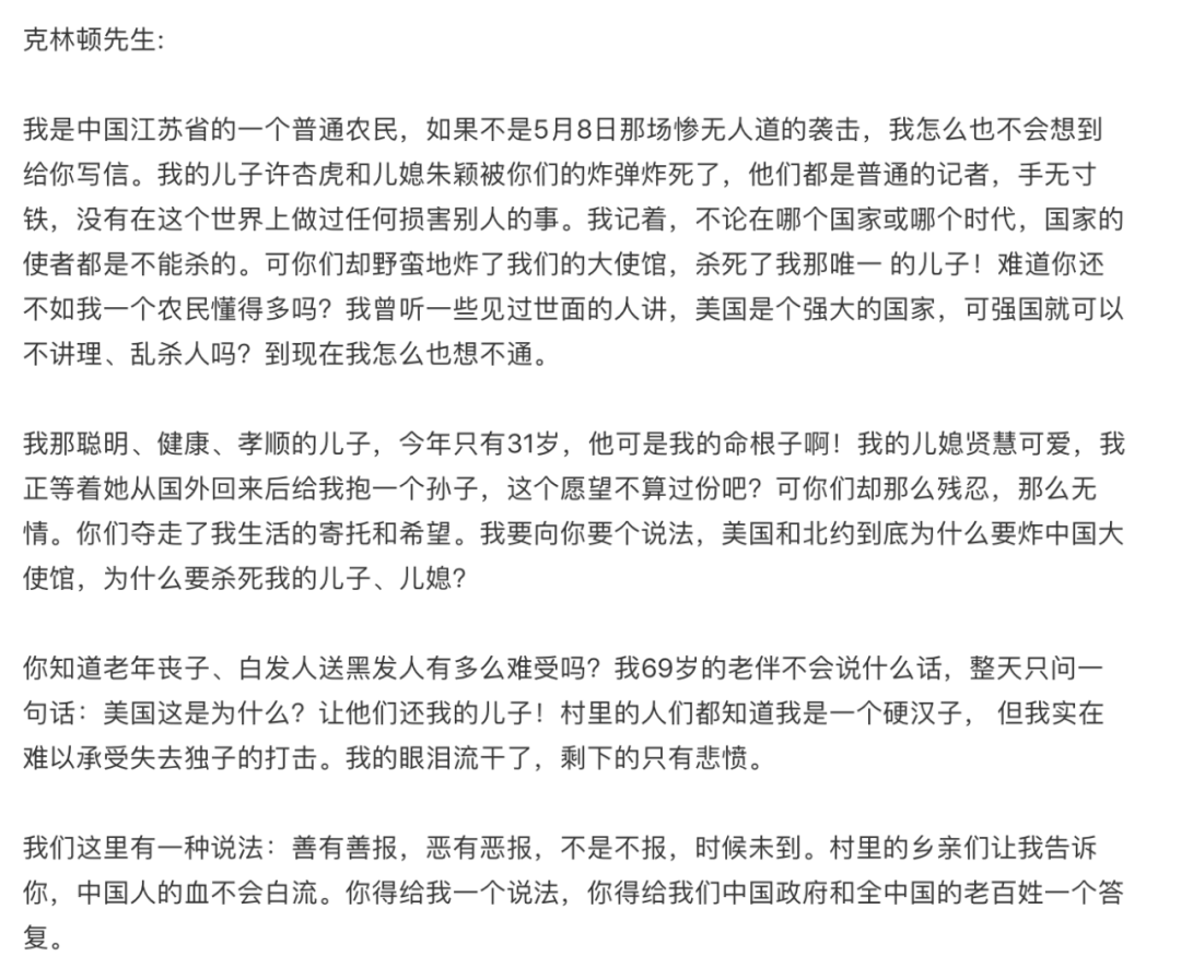 許杏虎和朱穎的父親,懷着巨大的悲痛,給時任美國總統分別寫了一封信。