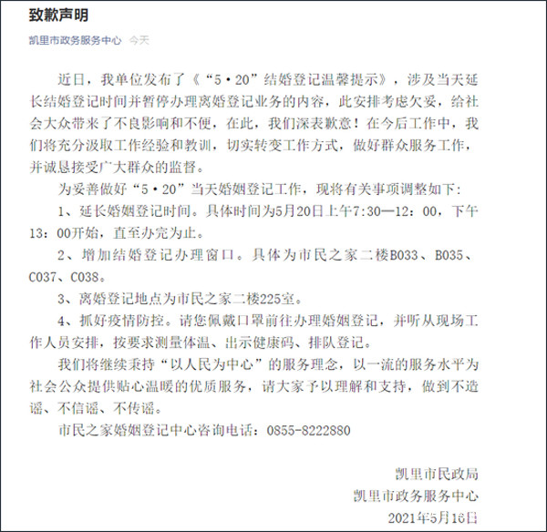 近日,我單位發佈了《“5·20”結婚登記温馨提示》,涉及當天延長結婚登記時間並暫停辦理離婚登記業務的內容,此安排考慮欠妥,給社會大眾帶來了不良影響和不便,在此,我們深表歉意!在今後工作中,我們將充分汲取工作經驗和教訓,切實轉變工作方式,做好羣眾服務工作,並誠懇接受廣大羣眾的監督。