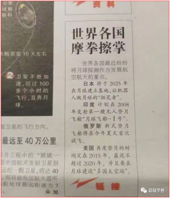 看到了中國立下了雄心壯志,其他國家也摩拳擦掌,制訂了各自的探月計劃。《科學發現報》的同一版面上,列着各國的月球探測計劃。