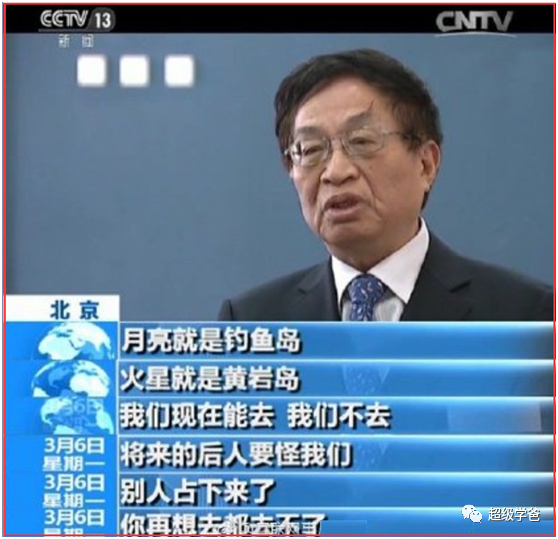 宇宙就是個海洋,月亮就是釣魚島,火星就是黃巖島,我們現在能去,我們不去,將來的後人要怪我們,別人去了,別人佔下來了,你再想去都去不了,我就想想這一條理由就夠了。