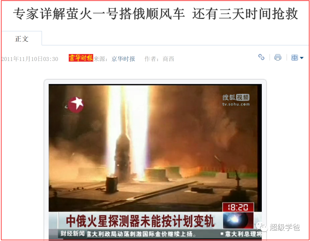 結果更坑的是,發射升空之後,某個發動機啓動失敗,未能脱離近地軌道,2012年1月16日,螢火一號跟俄羅斯福布斯·土壤一起墜入了太平洋。都怪這火箭不好聽——叫天頂2SB。