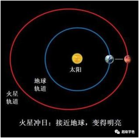 當地球跟火星“相遇”的時候,太陽、地球、火星基本三點一線,這時地火距離最近,火星亮度達到最大,成為夜空最亮的仔,比織女星還亮十幾倍,這種天文現象叫火星衝日。