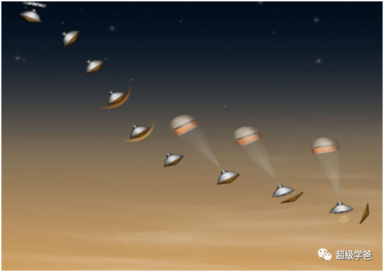 火星的空氣非常稀薄,地表的空氣也只是地球地表的1%。空氣稀薄則降落傘減速不夠,速度降到一定程度,還得甩掉防熱底,伸開緩衝腿,甩掉降落傘,用反推發動機減速。