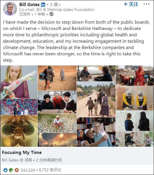 2020年3月13日,蓋茨從微軟董事會辭職。在提交給監管機構的新聞稿以及蓋茨領英上的動態帖子中,這位億萬富翁表示他希望專注於慈善事業,但也會繼續擔任微軟首席執行官薩提亞·納德拉(Satya Nadella)的技術顧問。同一天,蓋茨還辭去了巴菲特旗下投資公司伯克希爾·哈撒韋董事會的職務。