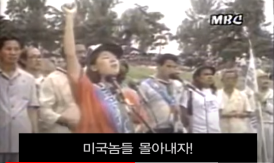 一次羣眾活動中,儘管多日車馬勞頓非常疲憊,但興奮的林秀卿依舊在大會上發表了演説。她説:“**如今我們民族最大的敵人,也是我們統一最大的障礙,就是駐在南方的美軍。**美國在這片土地上對我國人民犯下罪行已有45年之久,讓我們趕走美國佬!”講到此處,林秀卿高舉手臂,引領現場的朝鮮民眾,一起高喊:美國佬,滾出去!