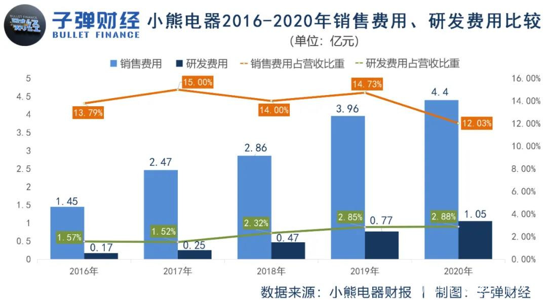 2016-2020年,小熊電器銷售費用分別為1.45億元、2.47億元、2.86億元、3.96億元和4.40億元,分別佔當期營收的13.79%、15.00%、14.00%、14.73%和12.03%。而同期,其研發投入分別為1653.33萬元、2507.68萬元、4739.25萬元、7651.52萬元和1.05億元,分別佔當期營收的1.57%、1.52%、2.32%、2.85%和2.88%。
