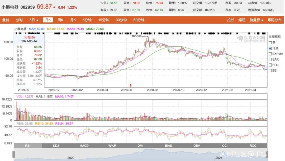 然而,2021年資本市場對小熊電器的熱情卻已不再,小熊電器股價一路下跌至5月14日的69.87元,與最高點時股價相比,已經“腰斬”。