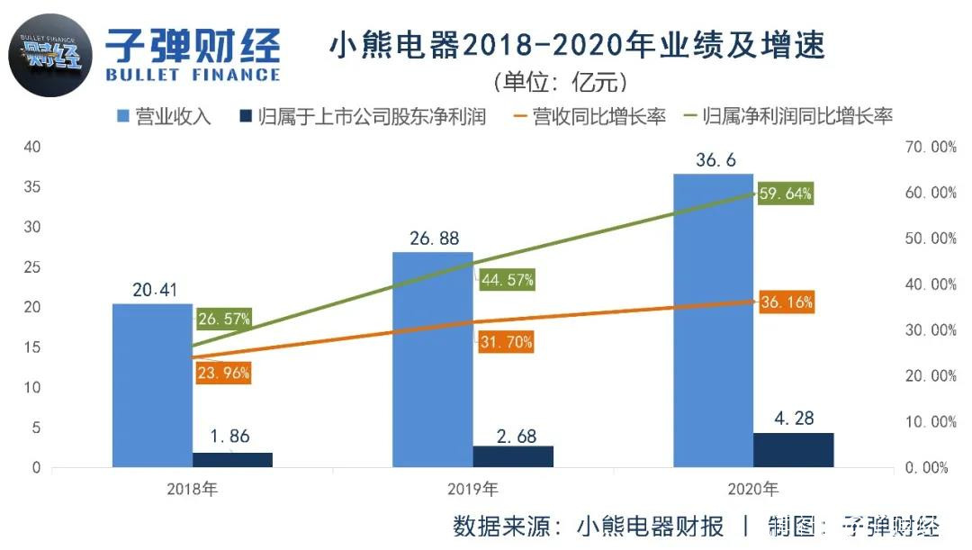 不過,與往年相比,小熊電器的成長性仍然值得肯定。2020年,小熊電器營收同比增長36.16%,達到36.6億元;實現歸屬於上市公司股東的淨利潤4.28億元,同比增長59.64%,均創下2018年以來的增速新高。