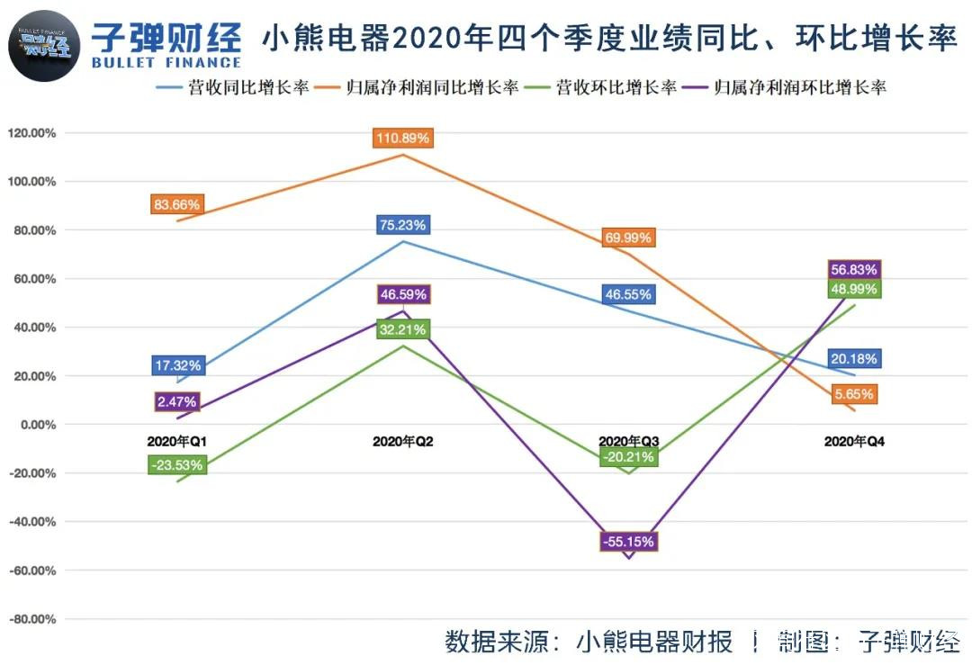 一般來説,第四季度是家電的銷售旺季,小熊電器2020年第四季度的營收、歸屬於上市公司股東的淨利潤分別達到11.62億元、1.06億元,分別環比增長48.99%、56.83%,增速創下四個季度中的最高記錄。