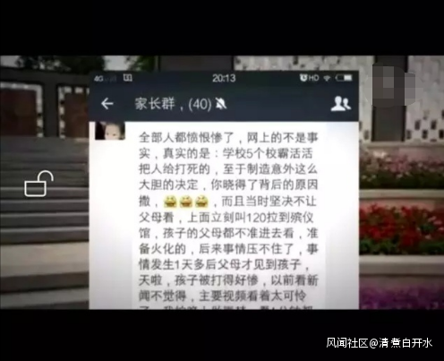 圖二:視頻稱此次案件為五名校霸打死學生,其中一校霸為鎮長之子。事實上,該謠言已被公安機關闢謠。