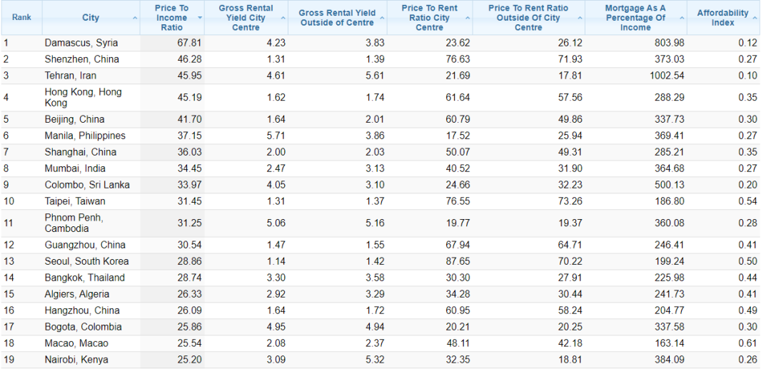 全球最大獨立居住消費數據庫Numbeo公佈的2021年按城市排名的全球房價和收入比排行,城市名稱後第一縱列數據為房價和收入比值。基礎數據和算法來自Case-Shiller Index, UK Housing Price Index等